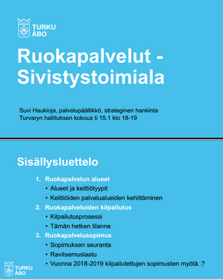 | Ruokapalvelut Sivistystoimialan uudet ruokapalvelusopimukset Turva ry 15.1.2019_lyhennetty.pdf (597 kB) Turun kaupungin ruokapalvelupäällikön esitys Turvaryn hallituksen kokouksessa 15.1.2019 |