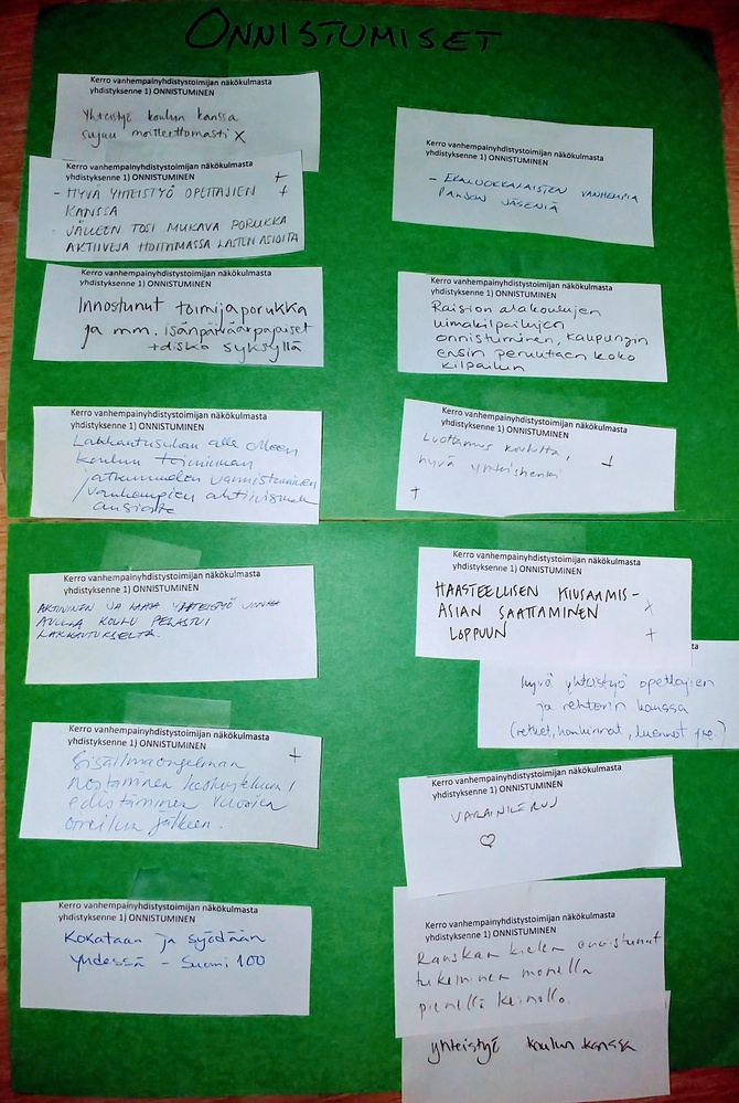 Onnistumiseksi kirjattiin ilahduttavan moneen lappuun hyvä yhteistyö koulun kanssa. Rastit lapuissa tarkoittavat "näin meilläkin"-tykkäyksiä muilta osallistujilta.